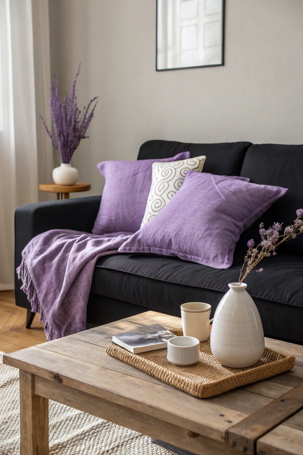 Throw pillows are my go-to for experimenting with color schemes. Lavender pillows on a black sofa offer a quick, affordable way to create visual contrast.