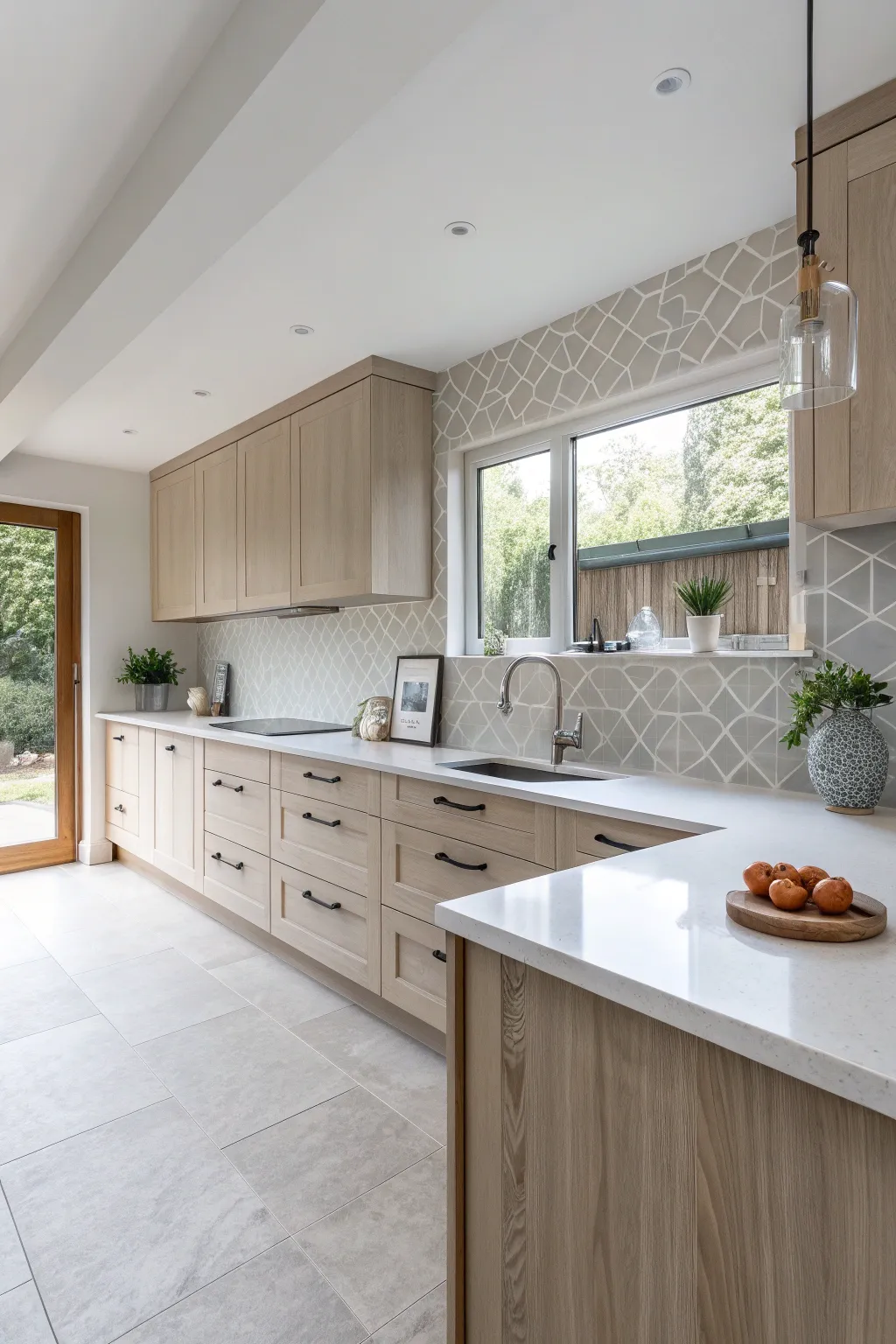 Combine a white quartz backsplash with natural wood accents for a warm, balanced look. This pairing brings a touch of nature indoors.