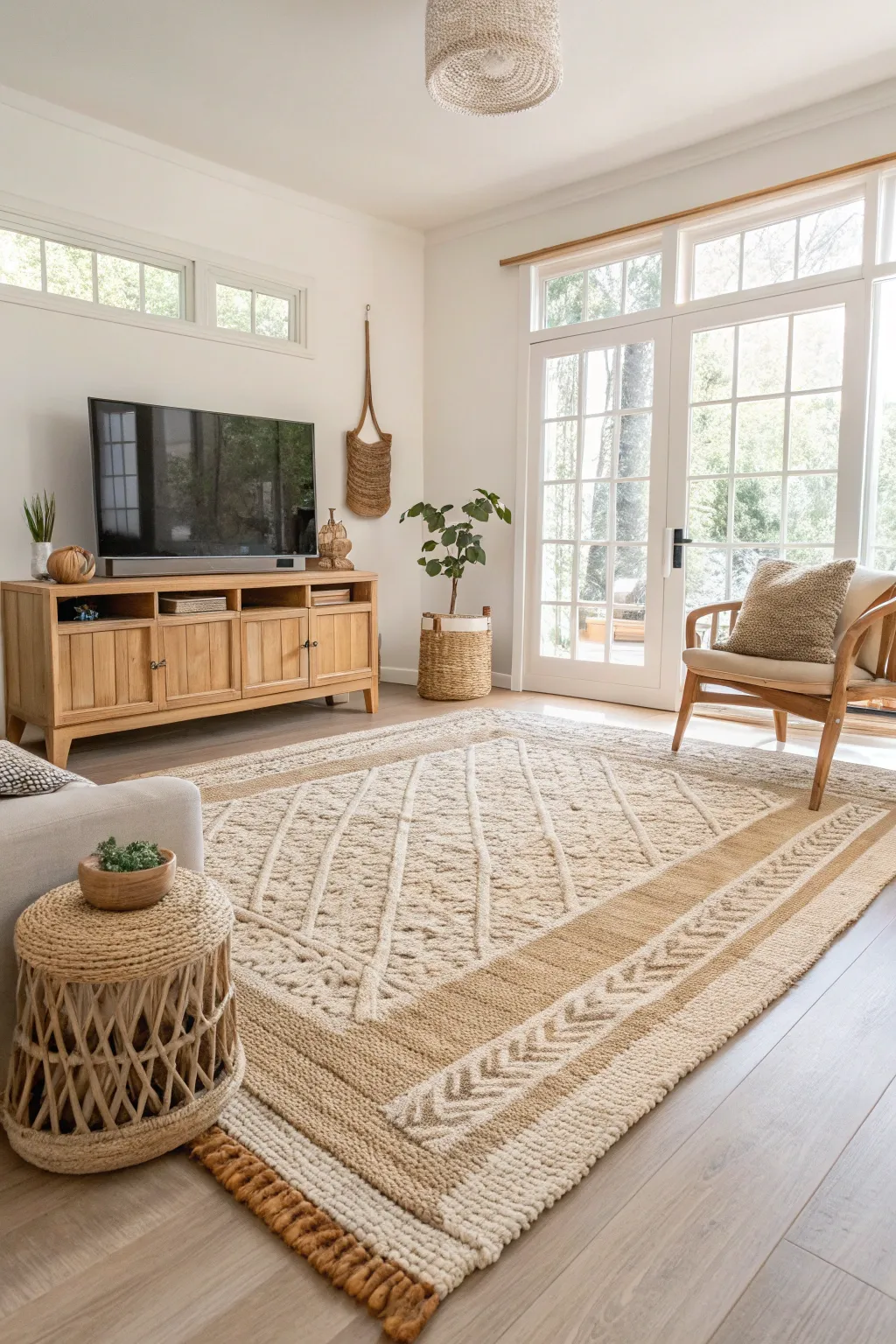- Large Neutral Base Rug: Anchor your design with a large neutral rug, perfect for versatile layering in any room.