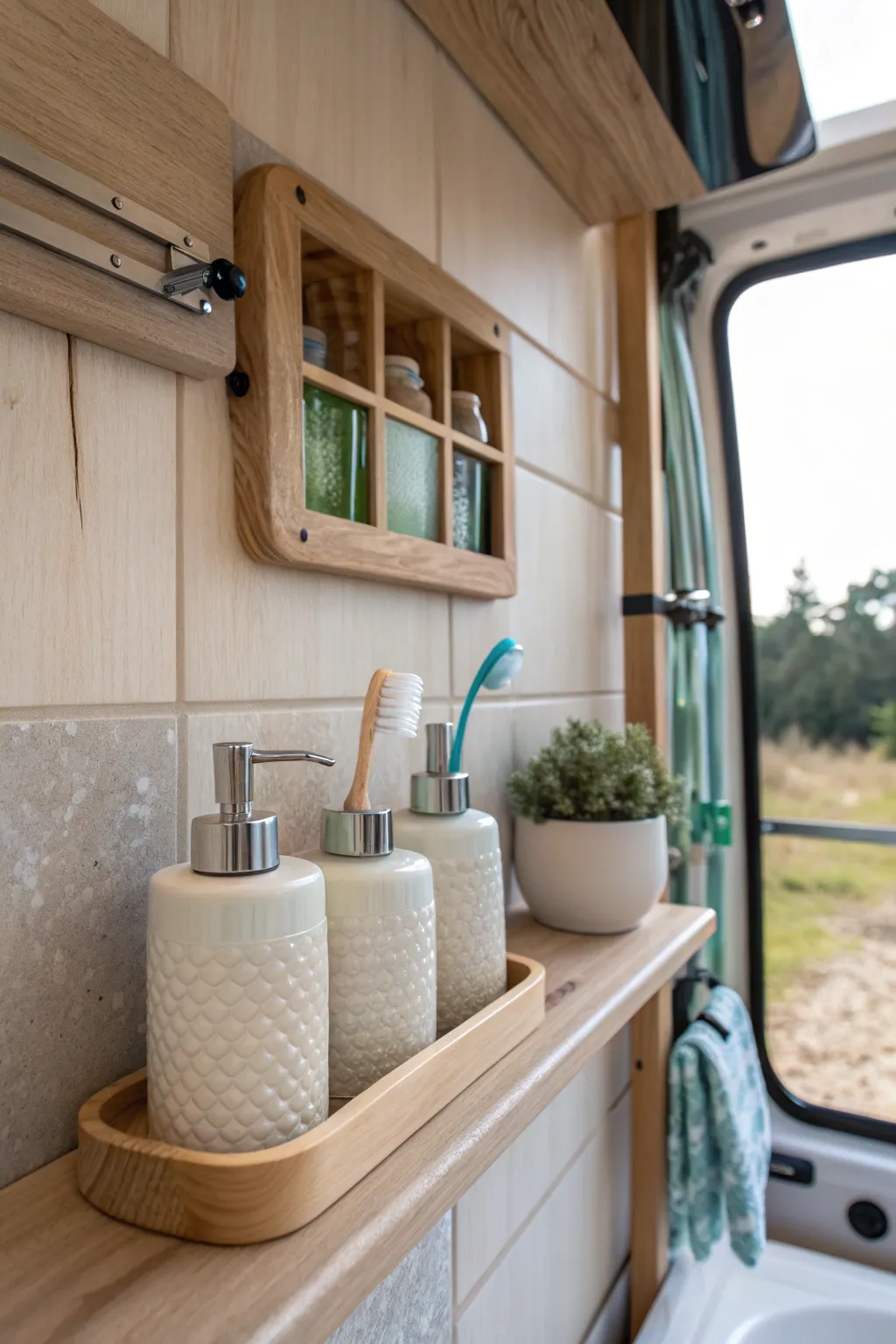 - White Vanity Organizers: Maximize your RV bathroom’s storage with sleek white organizers for a clean, spacious look.