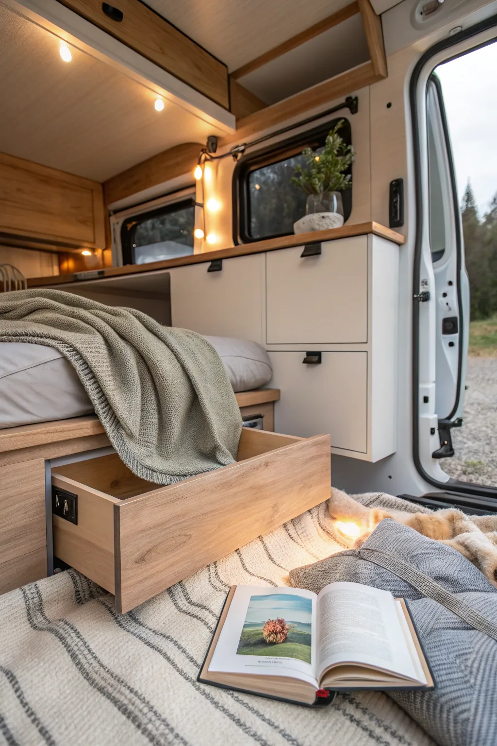 - Cedar Wood Drawer Organizers: Organize efficiently with cedar wood separators, providing a fresh, natural fragrance to your van.