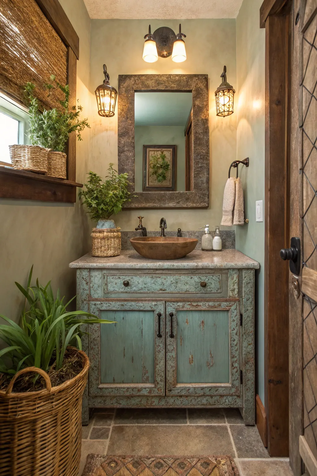 Furniture or fixtures with distressed finishes can enhance the rustic aesthetic. I often recommend distressing a cabinet or vanity for that lived-in appeal.