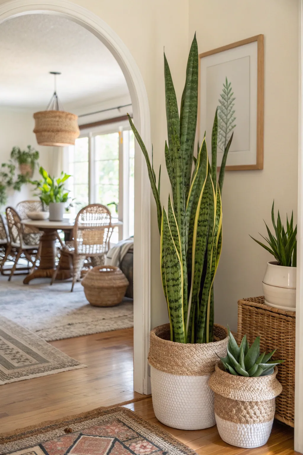 Use tall snake plants to create a natural room divider in open-plan spaces. They offer a stylish way to define areas without closing them off.