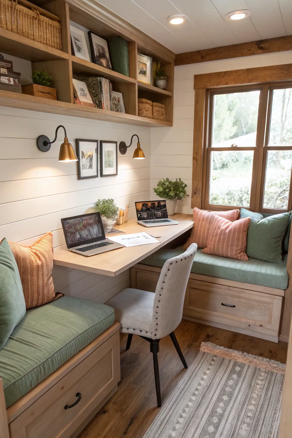 Transform a small nook into a cozy office for two with compact desks and plush seating. It’s an inviting space that encourages comfort and creativity.