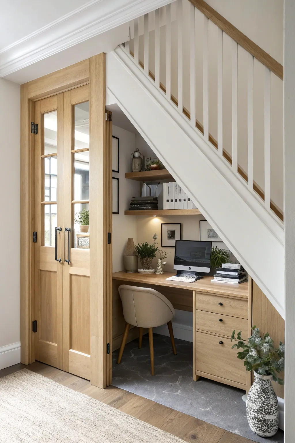 Create a harmonious look by matching the wood tones of your under-stairs doors to the staircase or nearby furniture. This approach ties the room together beautifully.