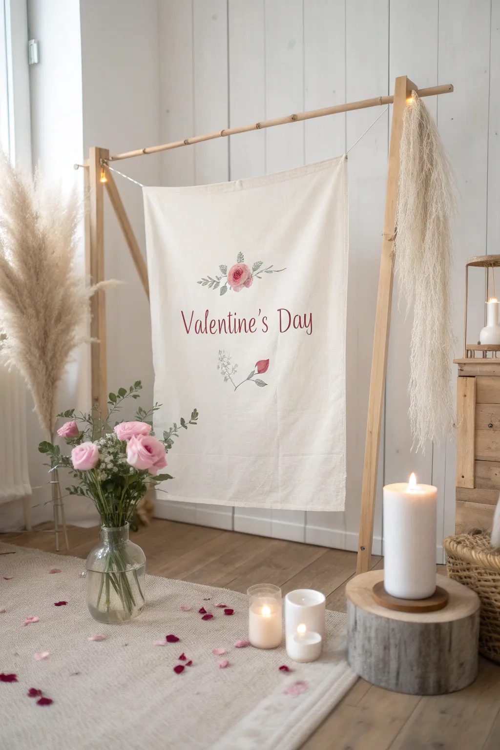For a cozy touch, try a rustic wooden backdrop adorned with heart motifs. It adds a warm, homey feel that’s perfect for Valentine’s Day.