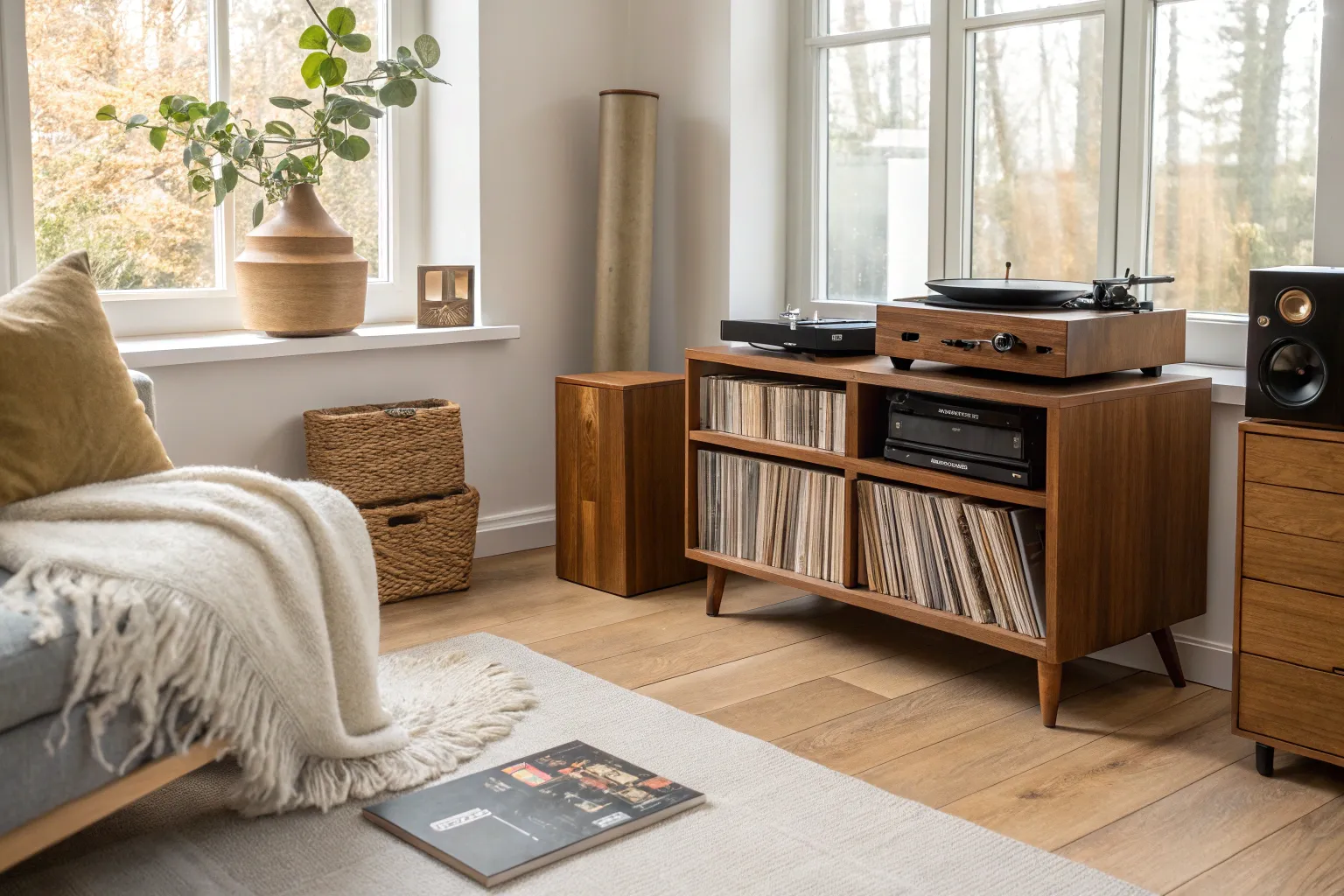 Create a cozy listening nook with a plush chair and a soft rug to enhance your listening experience. I adore how a well-placed lamp can transform this space into a warm retreat.