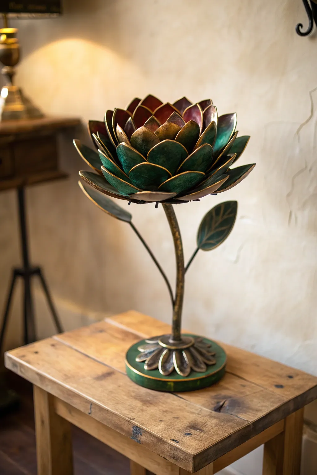 Design a flower with layered metal petals for a three-dimensional effect. This sculpture adds depth and intrigue to simple spaces.