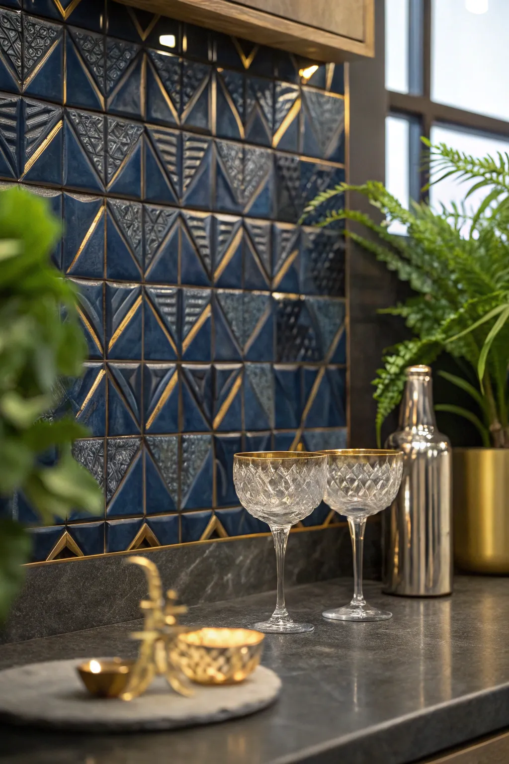 - Blue Geometric Backsplash Tile: Elevate your wet bar’s elegance with these stunning blue geometric tiles for visual richness.