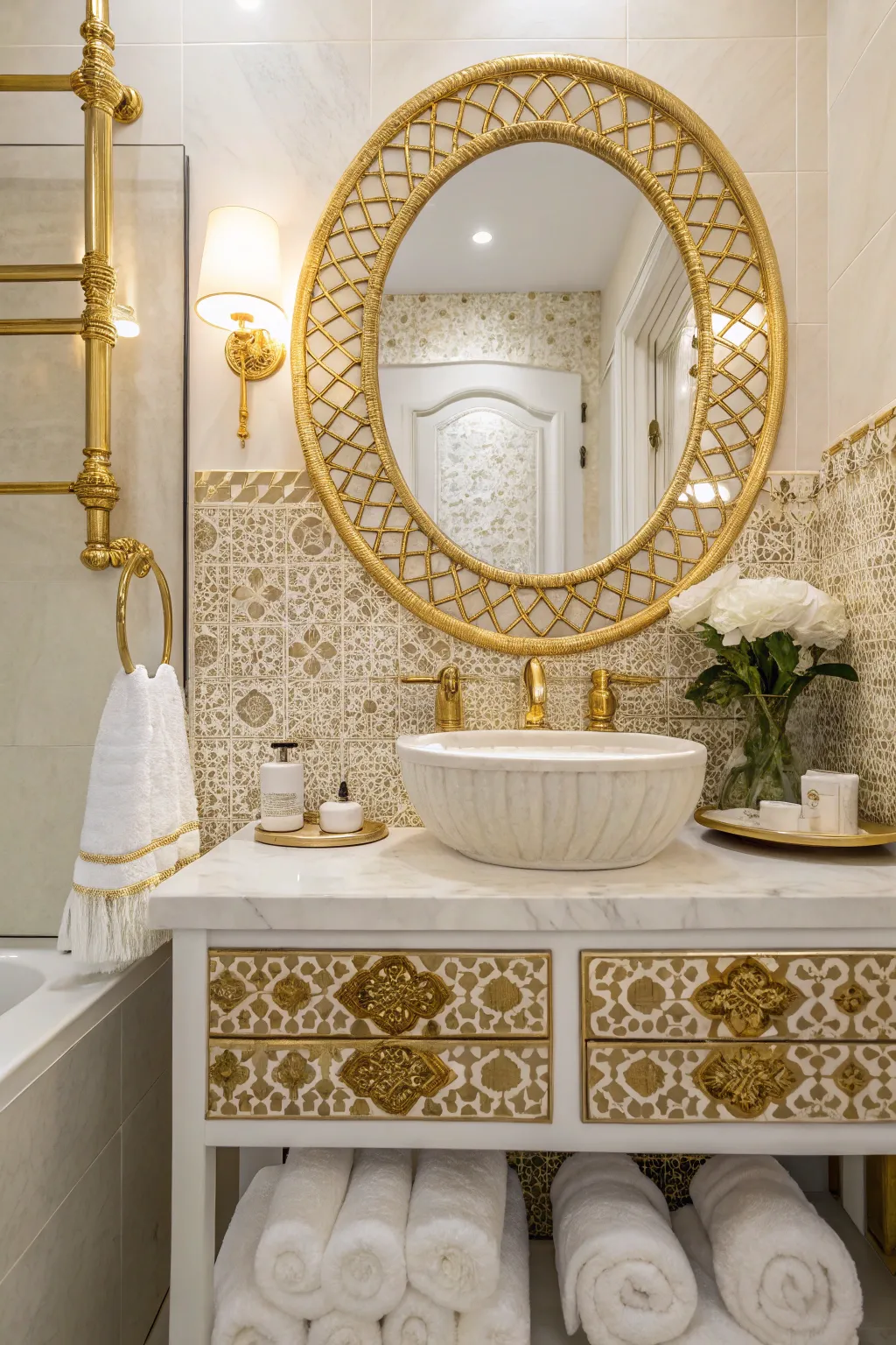 Mix textures by pairing smooth white surfaces with textured gold accents. This combination creates depth and interest, making your bathroom both stylish and inviting.