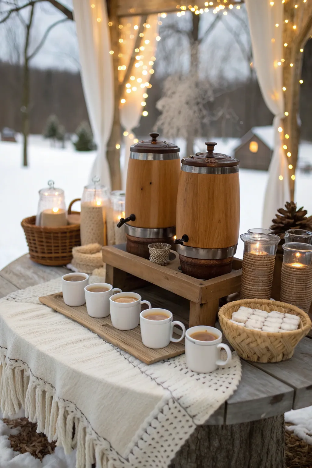 Set up a hot drink station with cocoa and mulled cider to keep guests warm and cozy. It’s a delightful way to embrace the winter theme and keep everyone toasty.